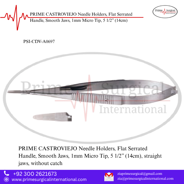 PRIME CASTROVIEJO Needle Holders, Flat Serrated Handle, Smooth Jaws, 1mm Micro Tip, 5 1/2” (14cm)