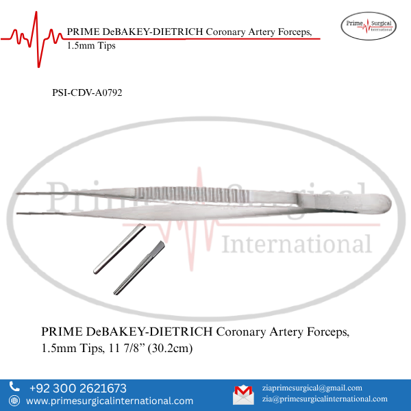 PRIME DeBAKEY-DIETRICH Coronary Artery Forceps, 1.5mm Tips. Material: German Stainless Steel • Stainless Steel Instrument • ISO 9001:2015 & CE MDR Certified