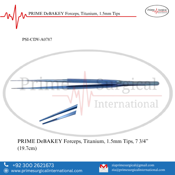 PRIME DeBAKEY Forceps, Titanium, 1.5mm Tips. Material: Titanium • Titanium Instrument • ISO 9001:2015 & CE MDR Certified