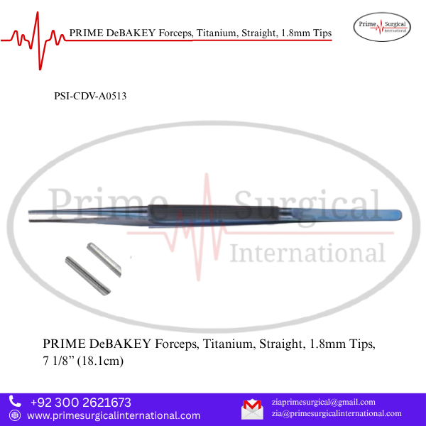 PRIME DeBAKEY Forceps, Titanium, Straight, 1.8mm Tips. Material: Titanium • Titanium Instrument • ISO 9001:2015 & CE MDR Certified