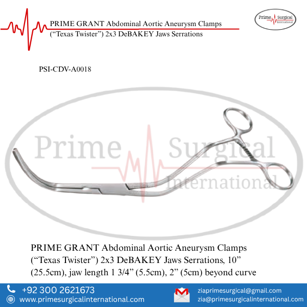 PRIME DeBAKEY Aorta Clamp 2×3 DeBAKEY Jaw Serrations, 10 5/8” (27cm), jaw length 2 1/4” (5.7cm) beyond curve