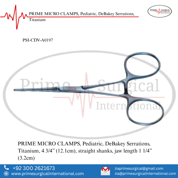 PRIME MICRO CLAMPS, Pediatric, DeBakey Serrations, Titanium. Material: Titanium • Titanium Instrument • ISO 9001:2015 & CE MDR Certified