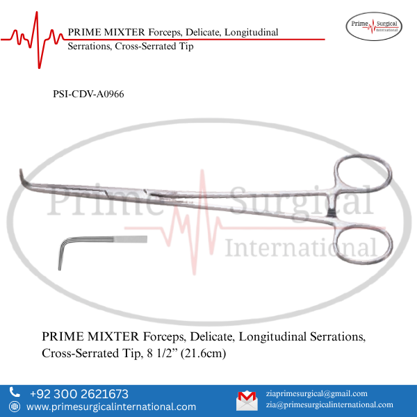 PRIME MIXTER Forceps, Delicate, Longitudinal Serrations, Cross-Serrated Tip. Material: German Stainless Steel • Stainless Steel Instrument • ISO 9001:2015 & CE MDR Certified