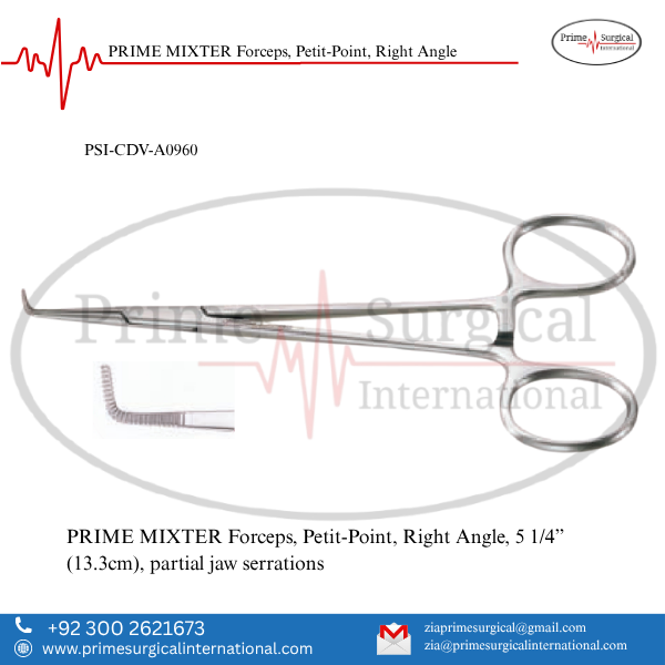 PRIME MIXTER Forceps, Petit-Point, Right Angle. Material: German Stainless Steel • Stainless Steel Instrument • ISO 9001:2015 & CE MDR Certified