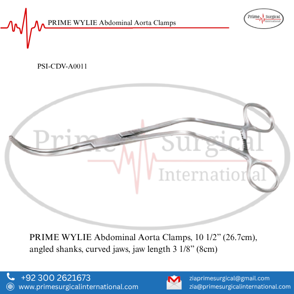 PRIME WYLIE Abdominal Aorta Clamps, 10 1/2” (26.7cm), angled shanks, curved jaws, jaw length 3 1/8” (8cm)