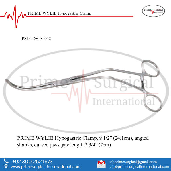 PRIME WYLIE Hypogastric Clamp, 9 1/2” (24.1cm), angled shanks, curved jaws, jaw length 2 3/4” (7cm)